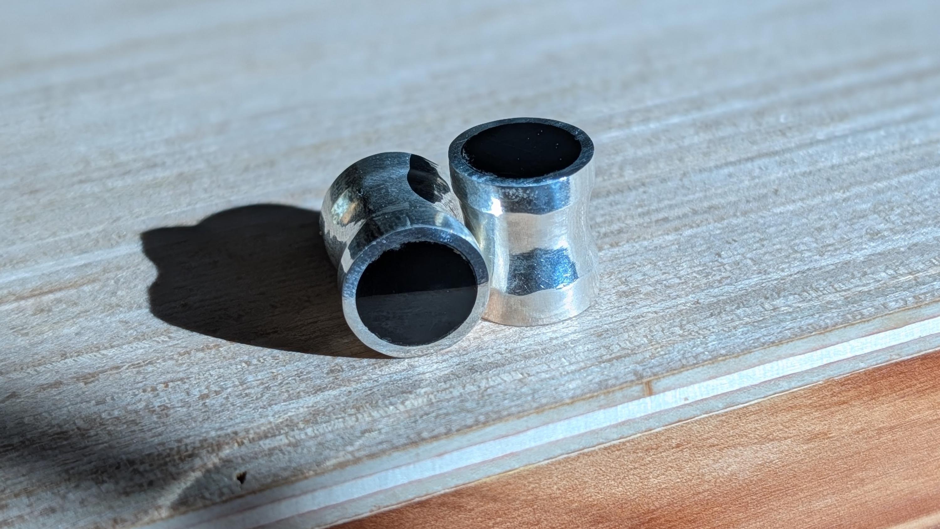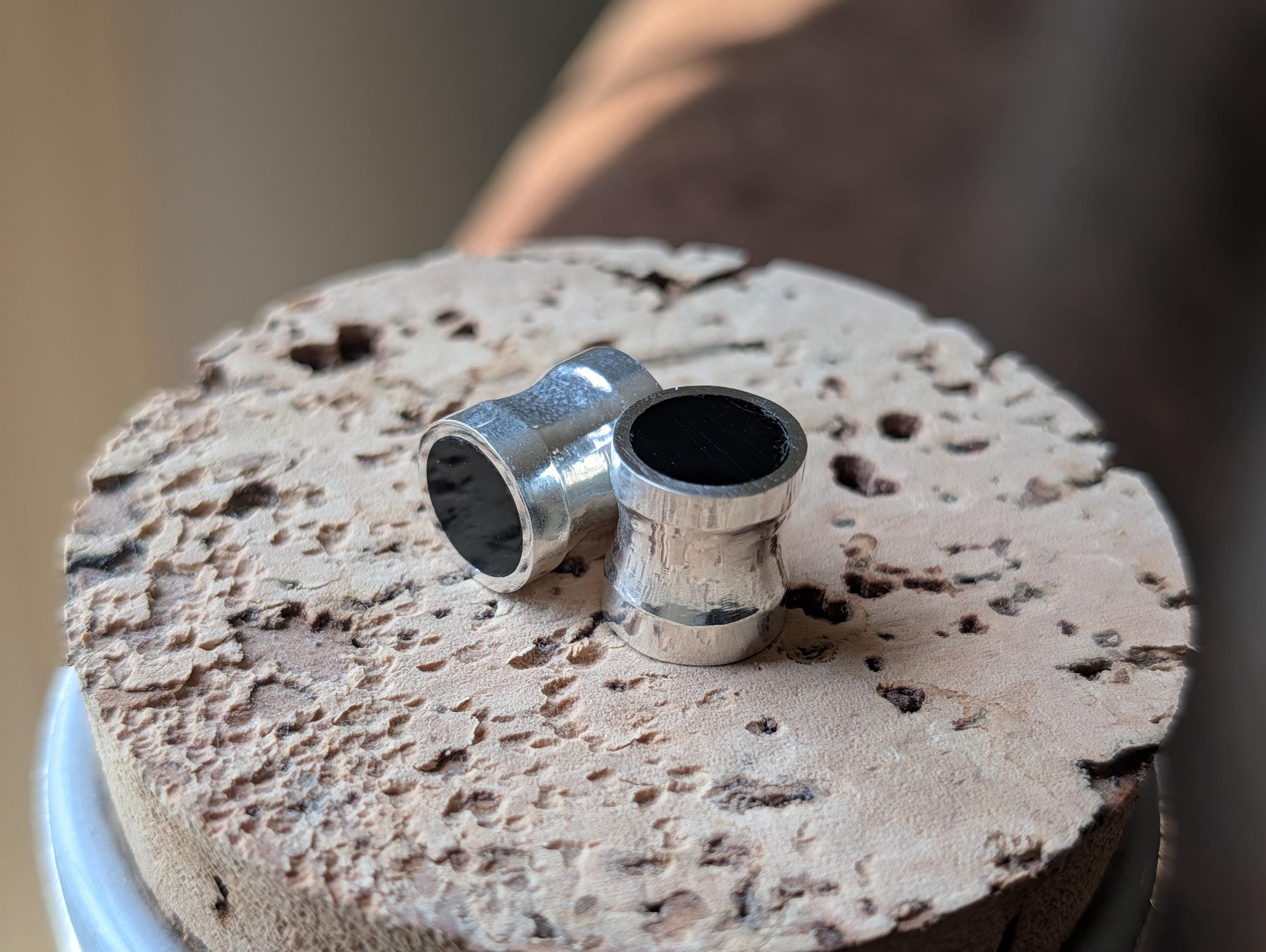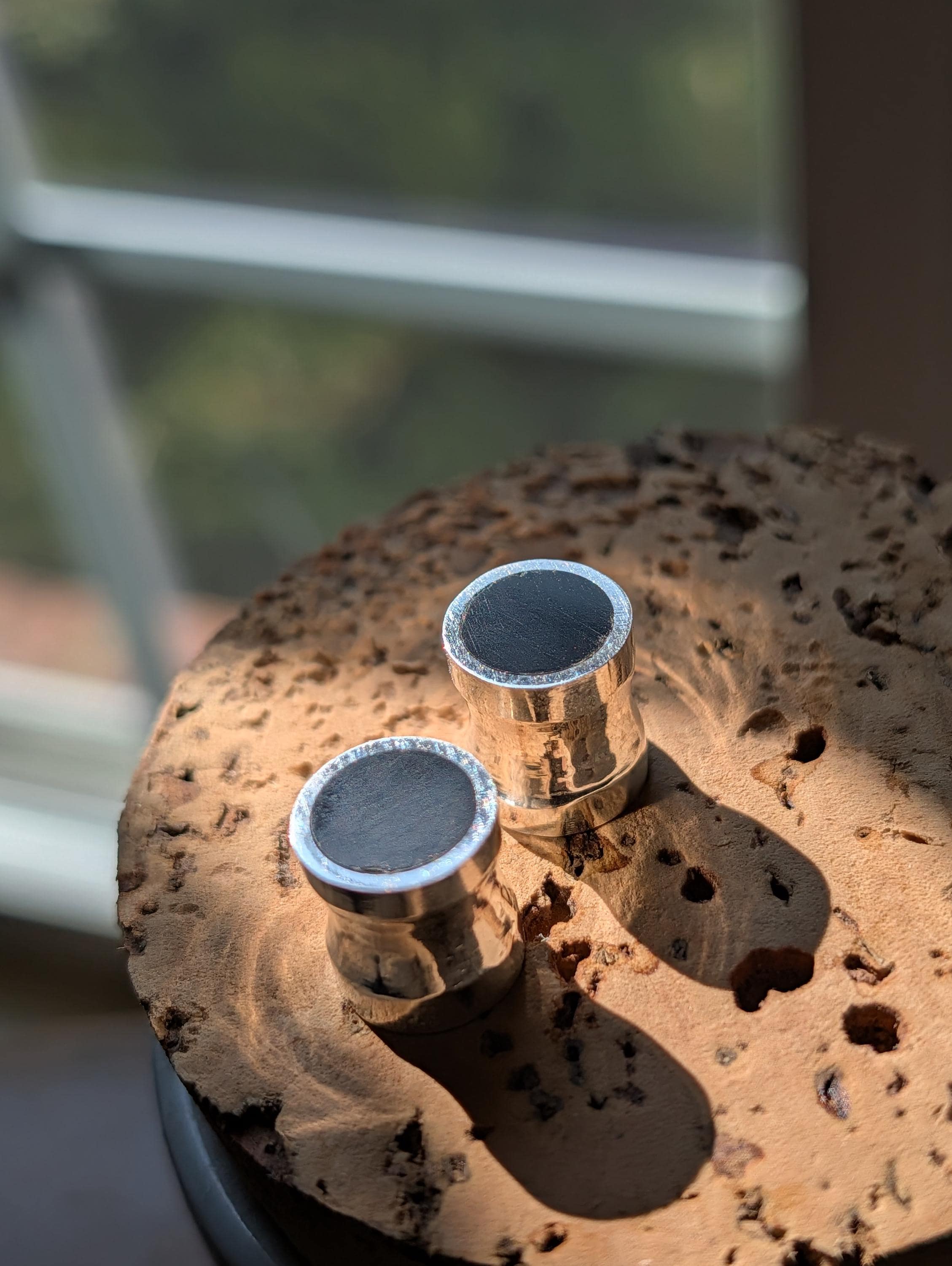 One of my latest additions to the lineup. Beautiful flared gauges of solid black onyx lined with Sterling Silver. The black onyx is flush with the silver on two of faces (other side capped with silver) I love the black shine to the faces. These seem to go well with everything. Even formal occasions.