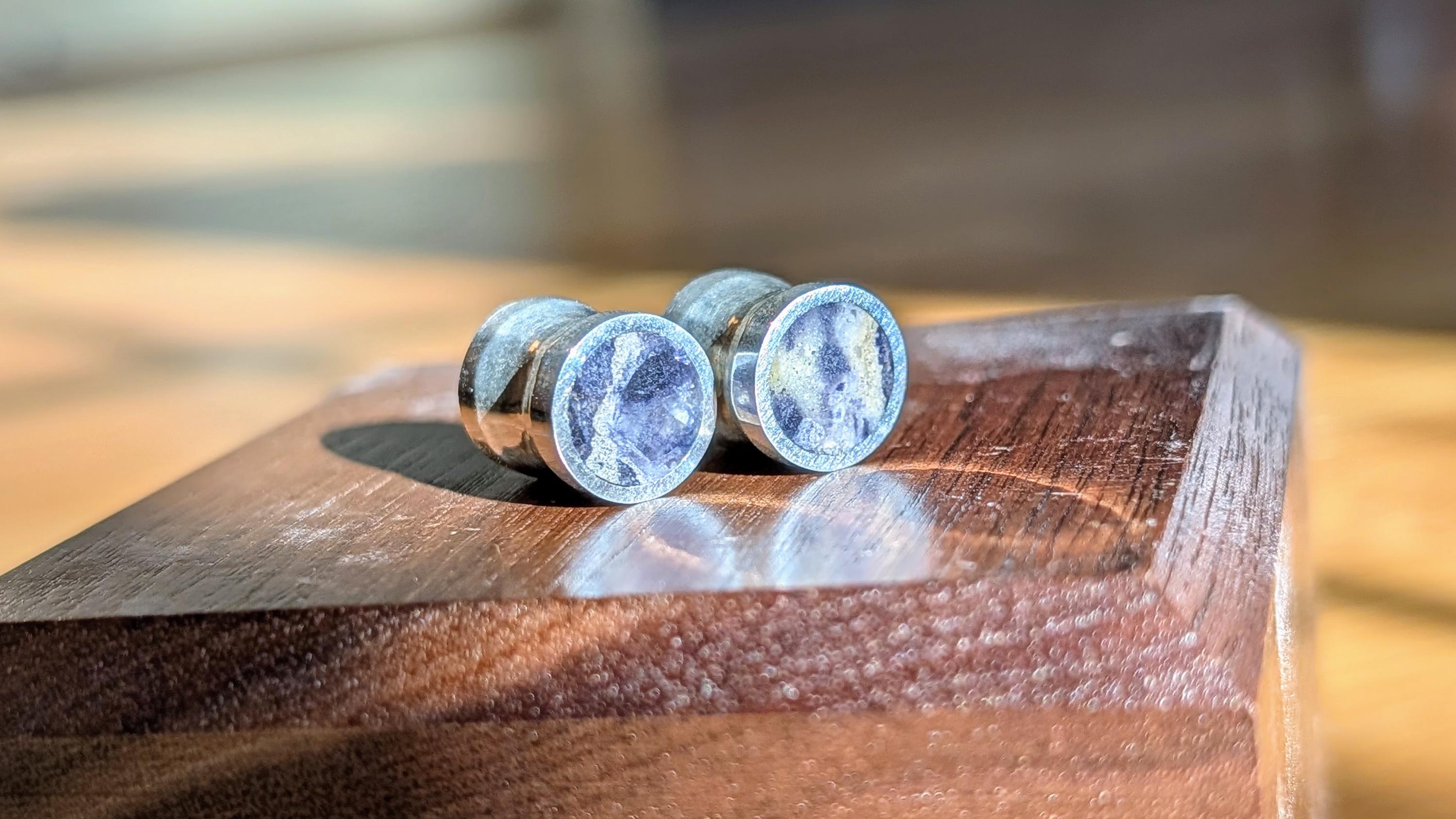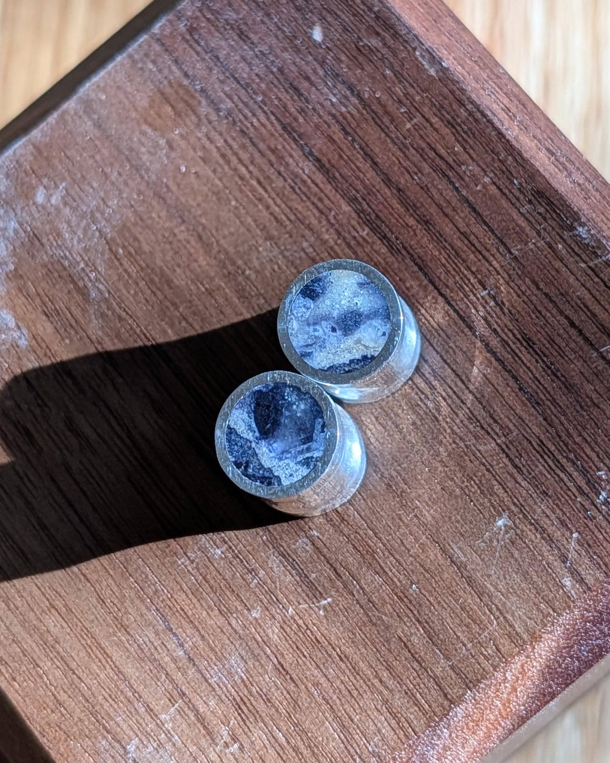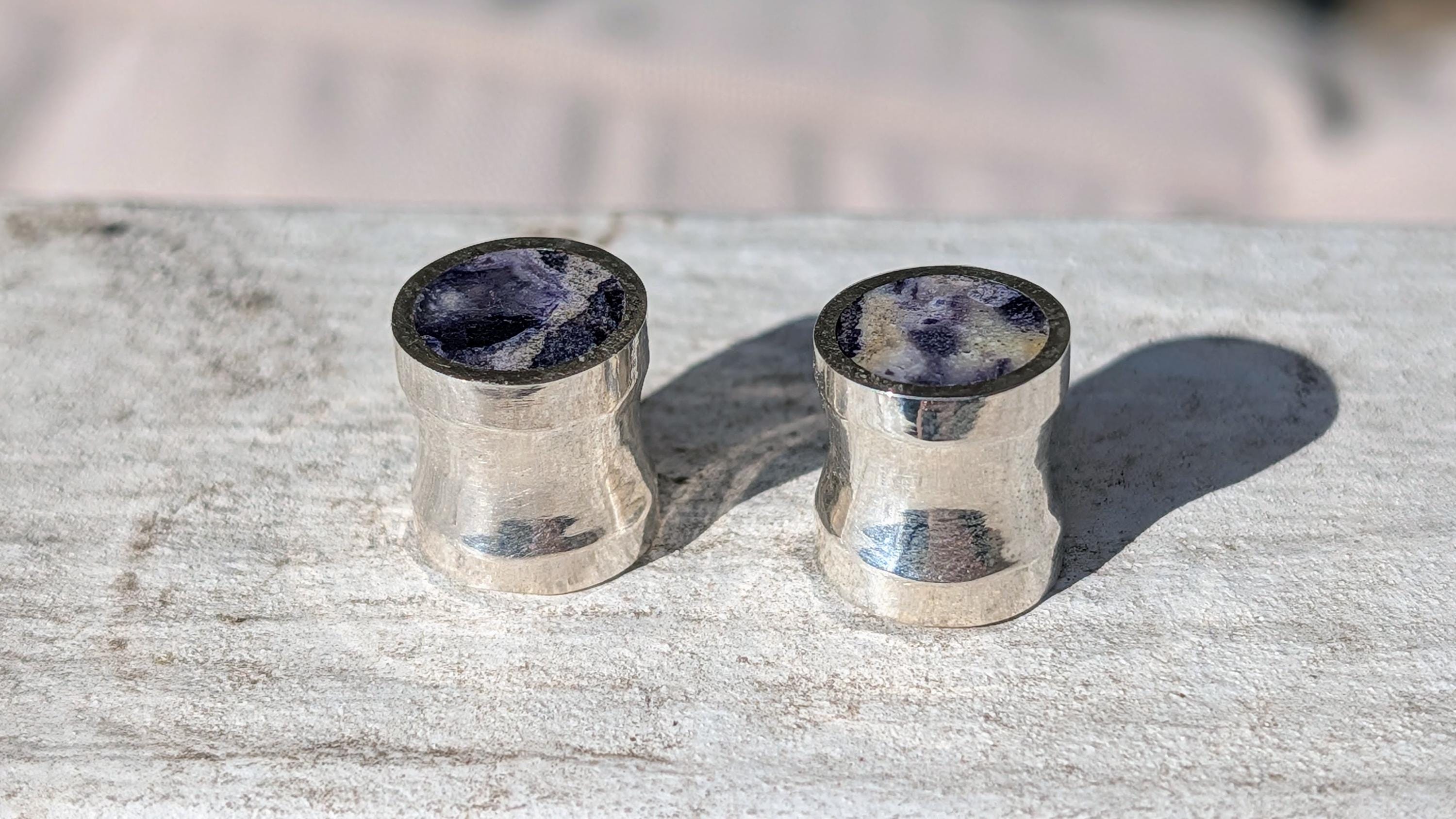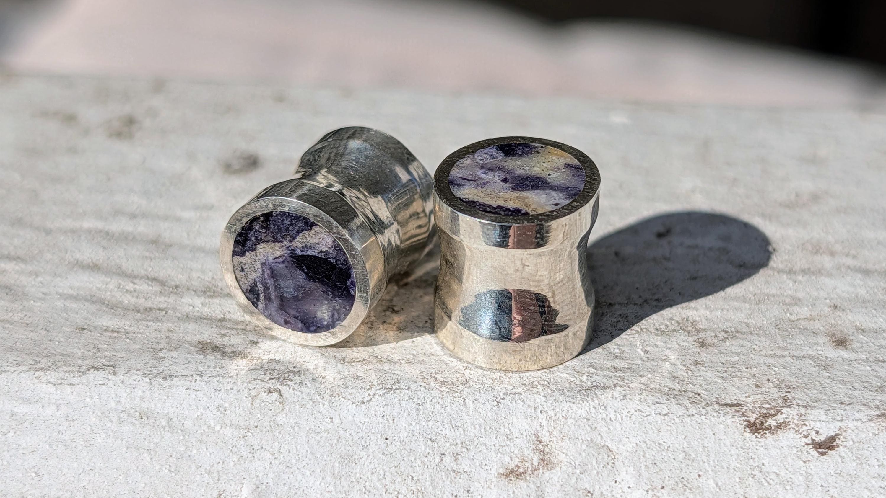 Just recently discovered Tiffany Stone. It's purple and white and sometimes even includes a little yellow. But natural Tiffany Stone is gorgeous. Beautiful flared gauges of Tiffany Stone lined with sterling silver. The stone is flush with the silver on two of the four faces. The other sides are capped with silver. Slight flare with the silver and small groove in the center fit to the gauge size.