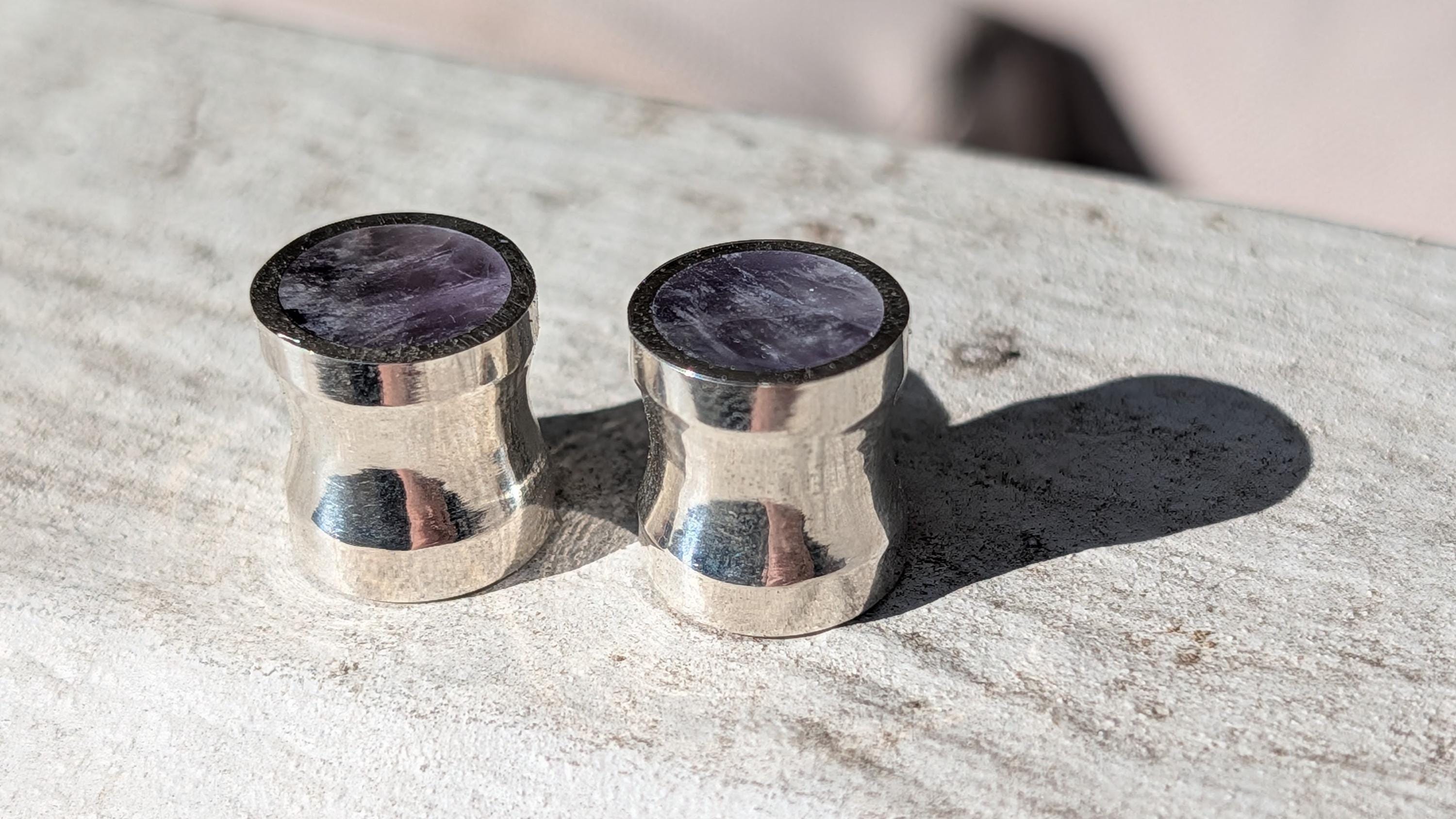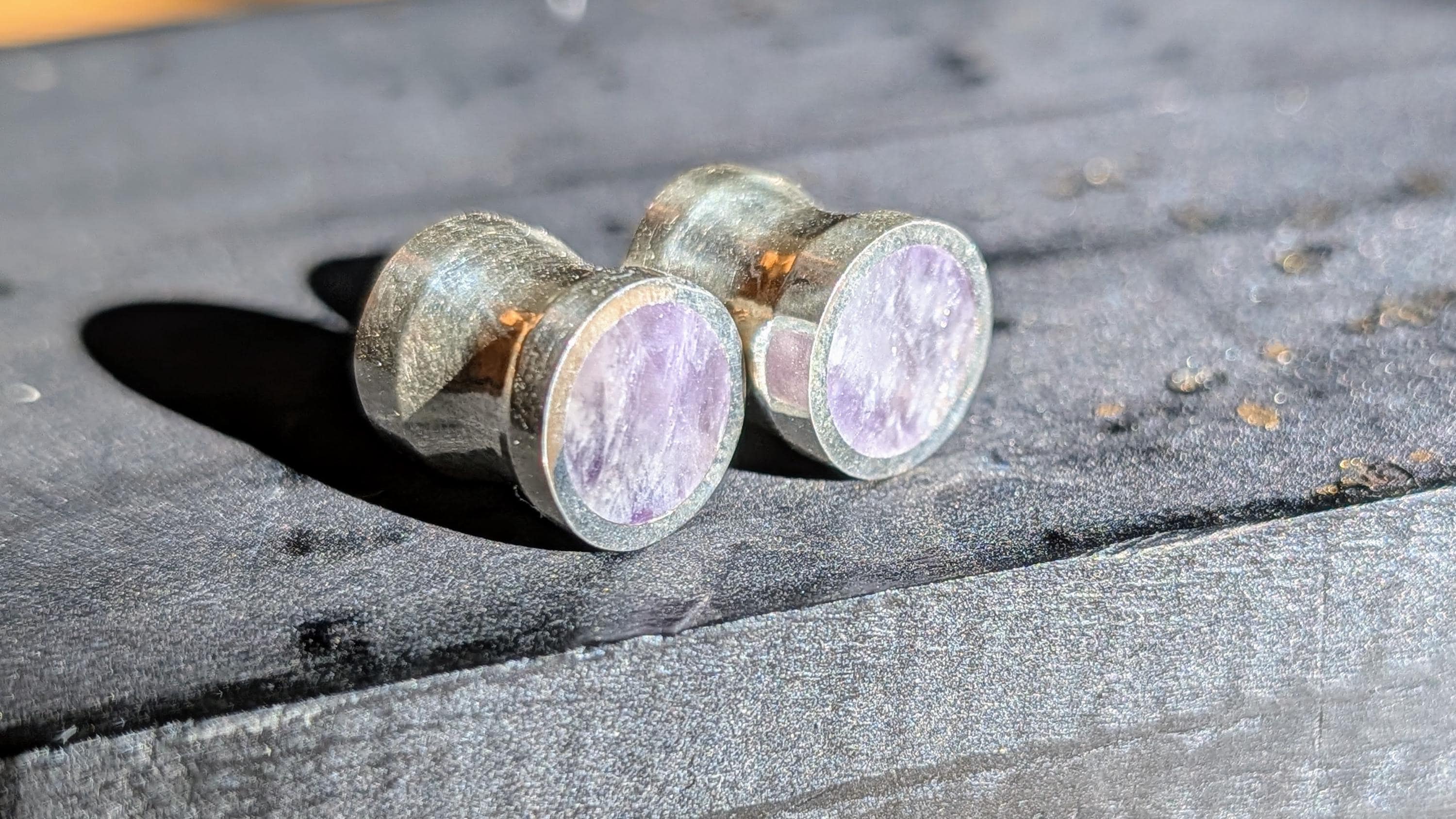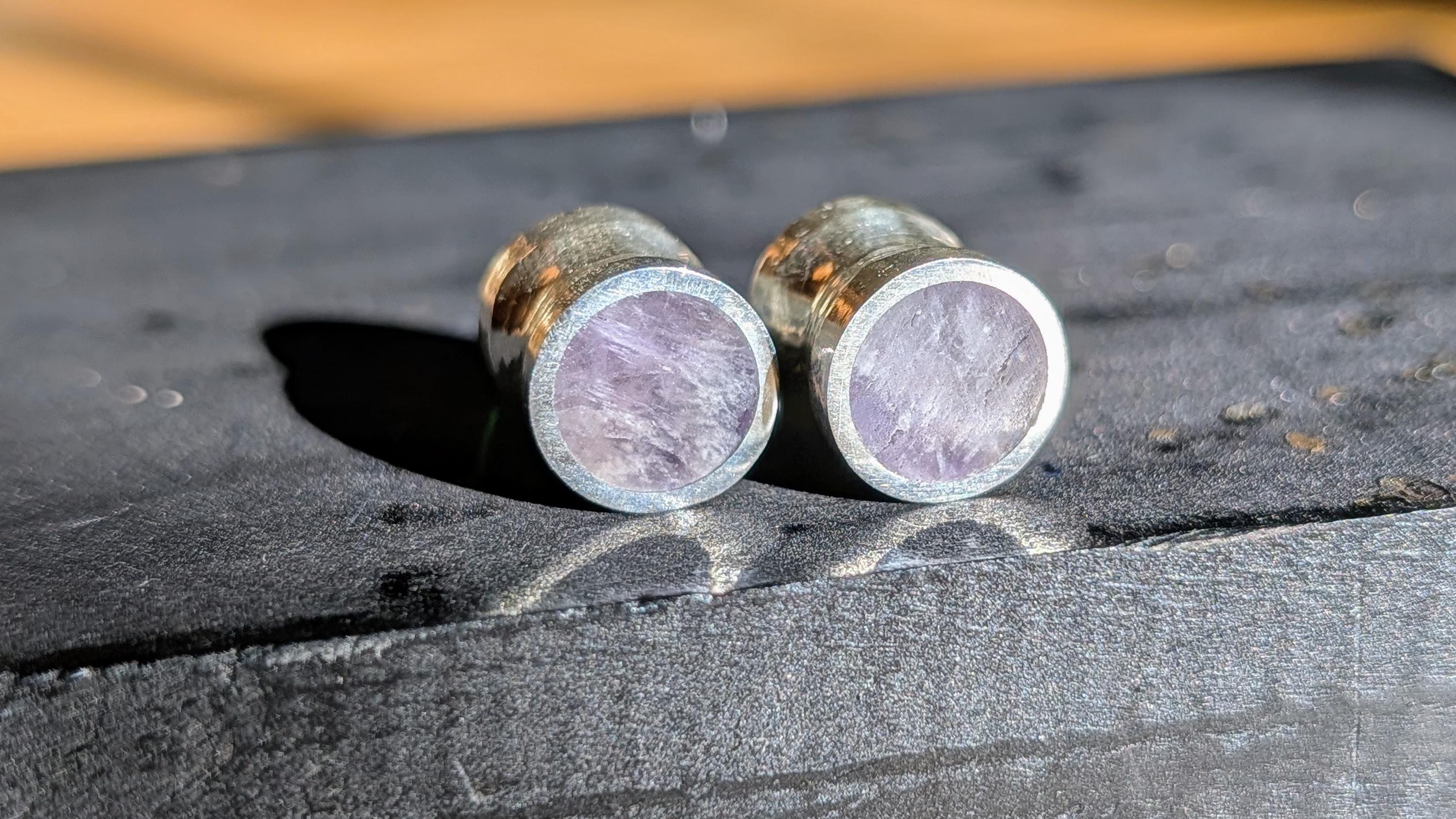 Solid amethyst! I used to offer only crushed amethyst, but this is so much nicer (in my opinion) especially for smaller sizes compared to crushed amethyst. No matter the size (6g to 1") though, it always looks good! If you're into purple and quartz, this is your set of plugs. It seems to work perfectly with my line and almost has a royal-like characteristic. Stunning flared gauges of solid amethyst quartz lined with sterling silver. The amethyst is flush with the silver on all four faces. Slight flare with the silver and small groove in the center fit to the gauge size.