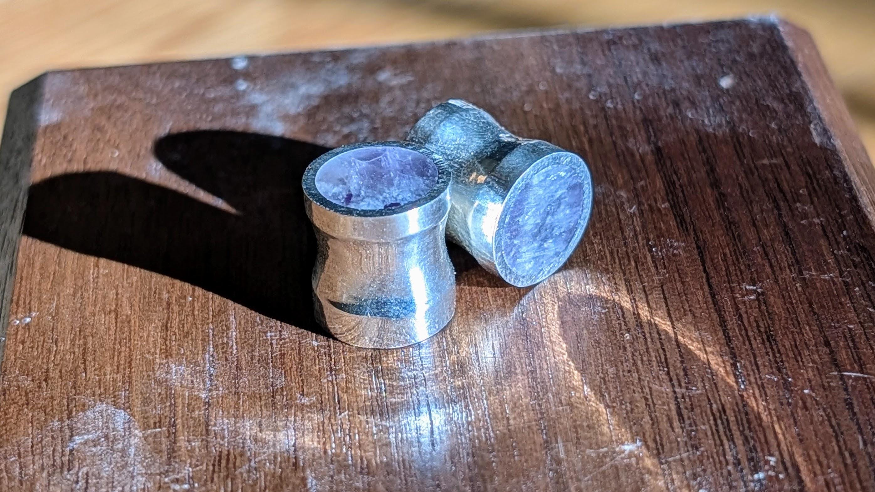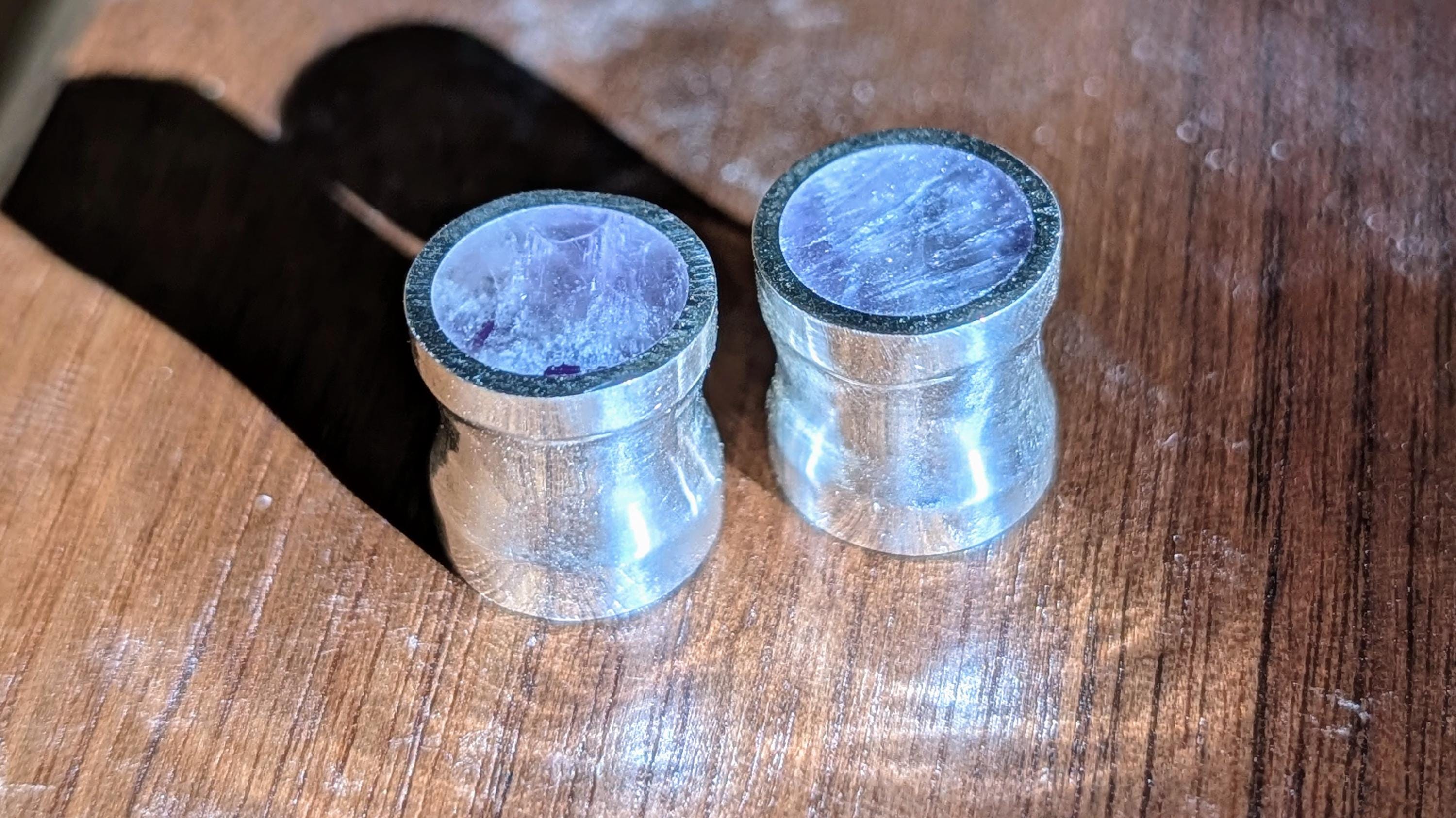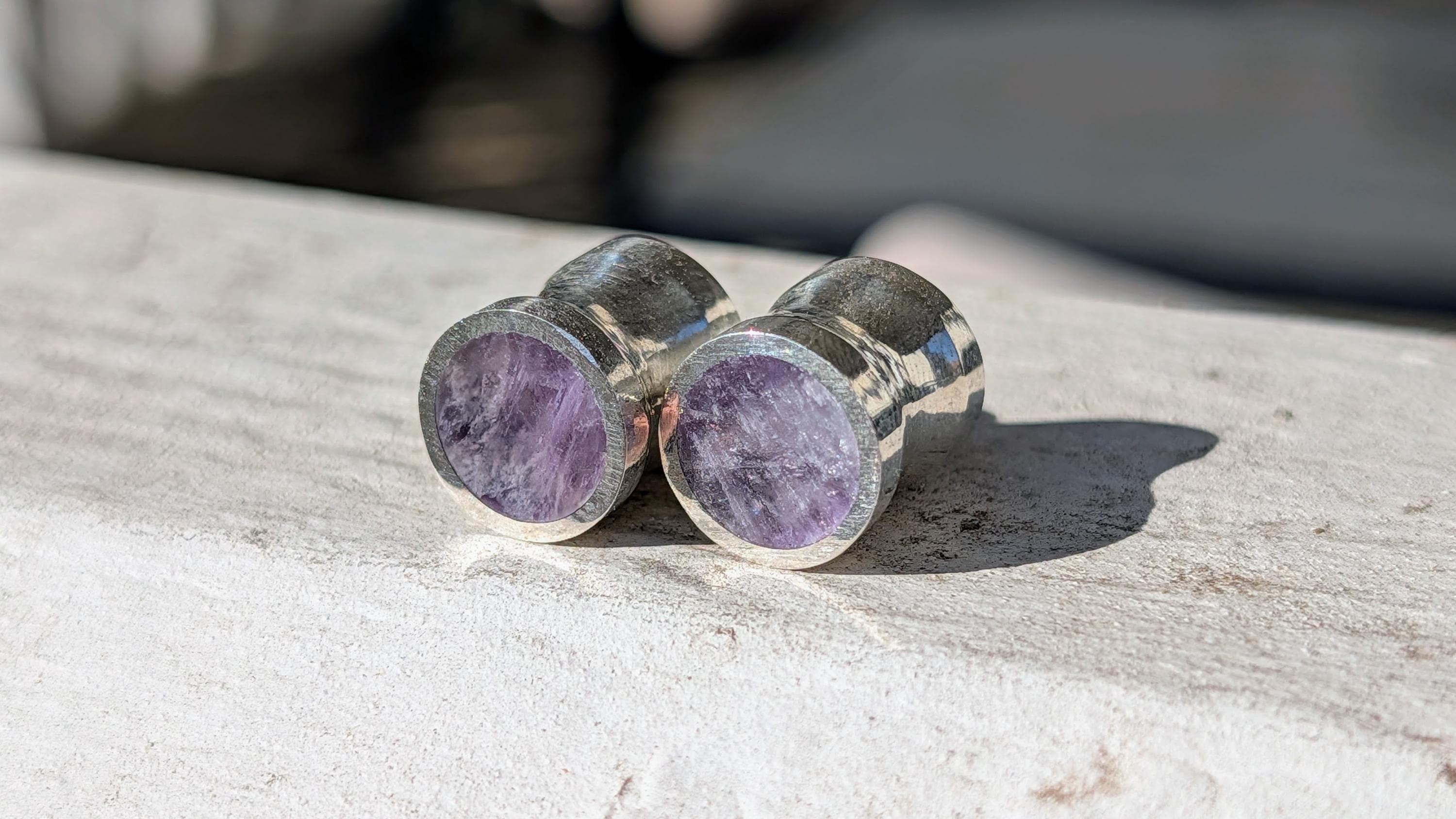 Solid amethyst! I used to offer only crushed amethyst, but this is so much nicer (in my opinion) especially for smaller sizes compared to crushed amethyst. No matter the size (6g to 1") though, it always looks good! If you're into purple and quartz, this is your set of plugs. It seems to work perfectly with my line and almost has a royal-like characteristic. Stunning flared gauges of solid amethyst quartz lined with sterling silver. The amethyst is flush with the silver on all four faces. Slight flare with the silver and small groove in the center fit to the gauge size.