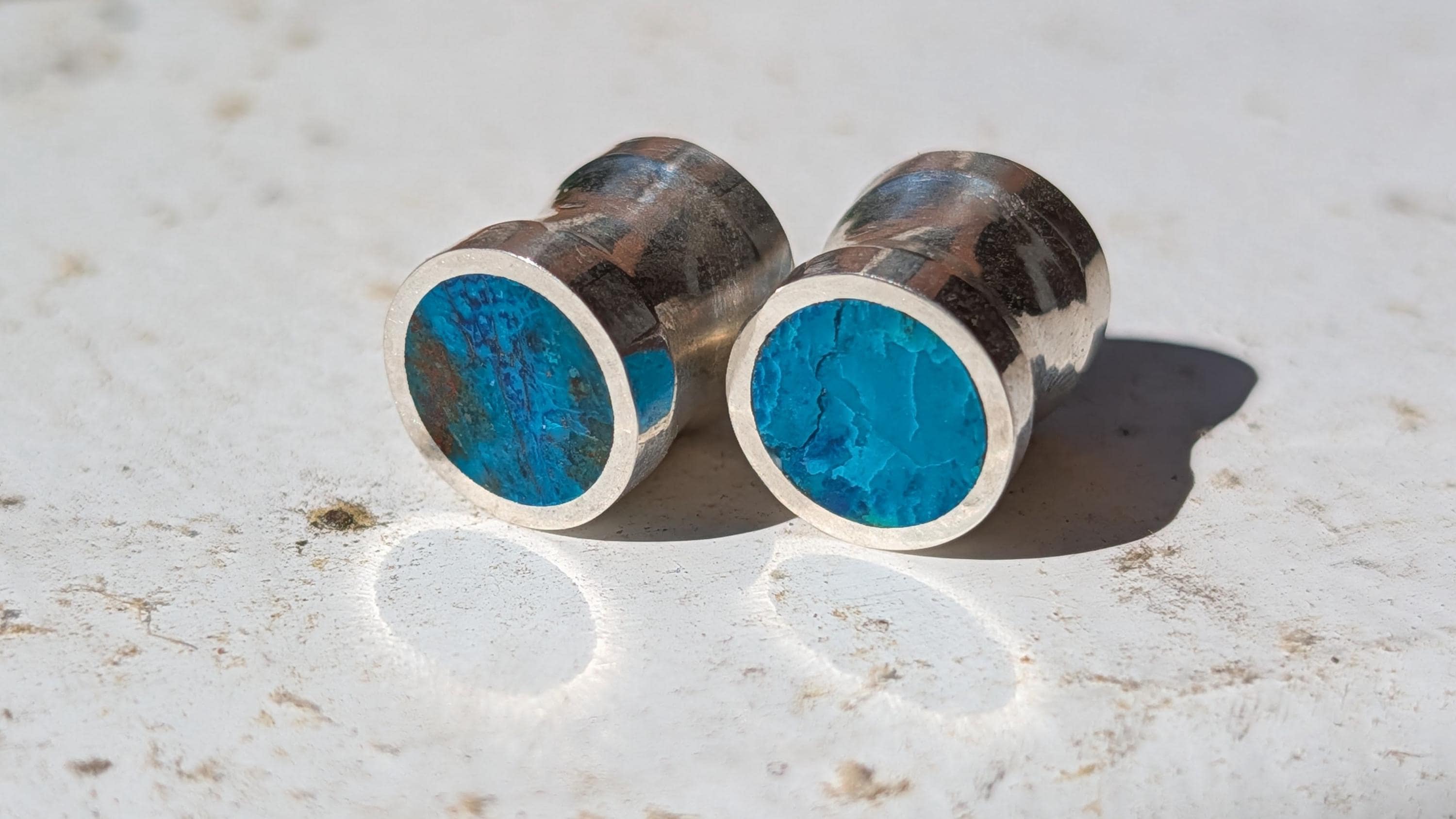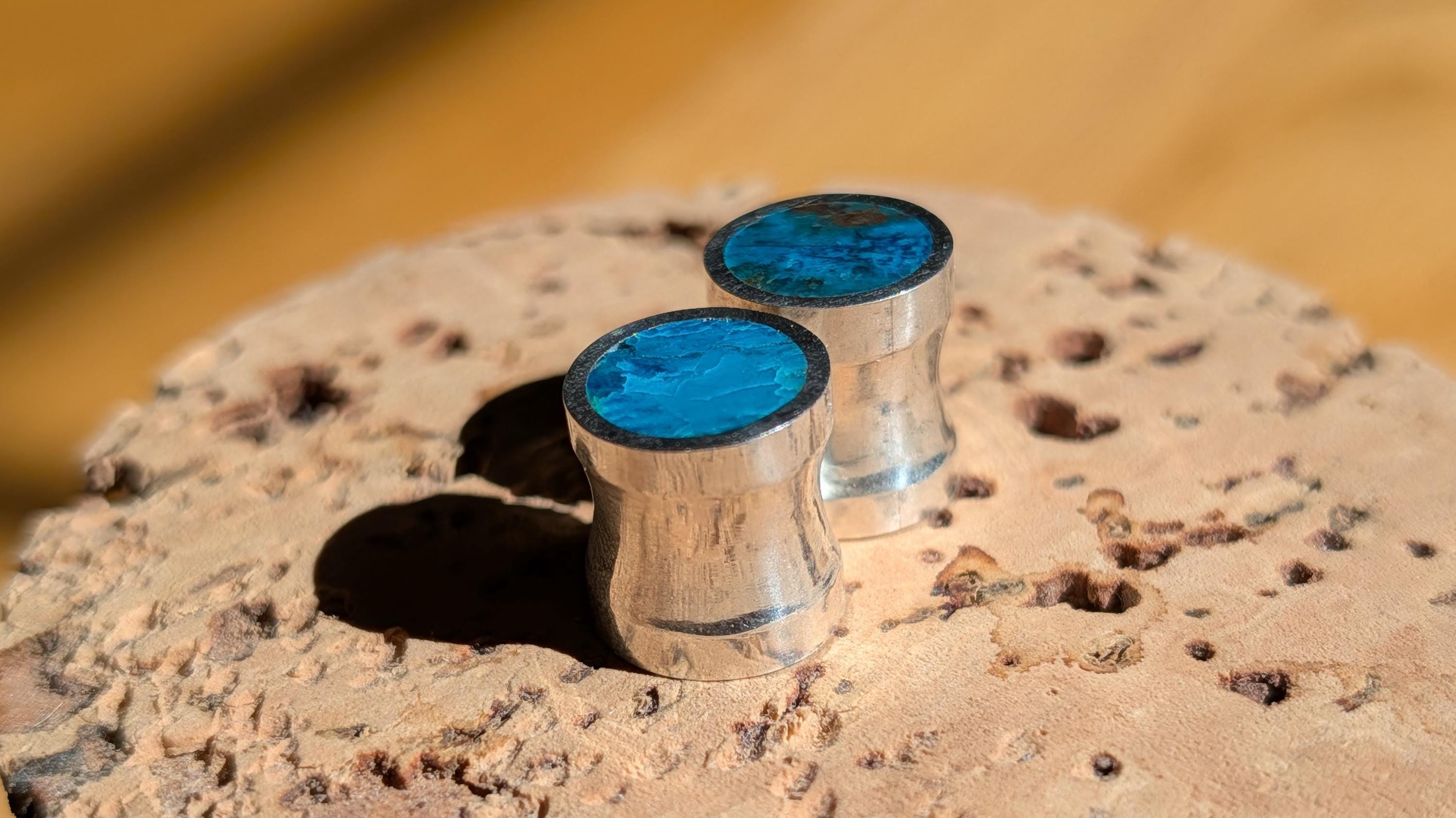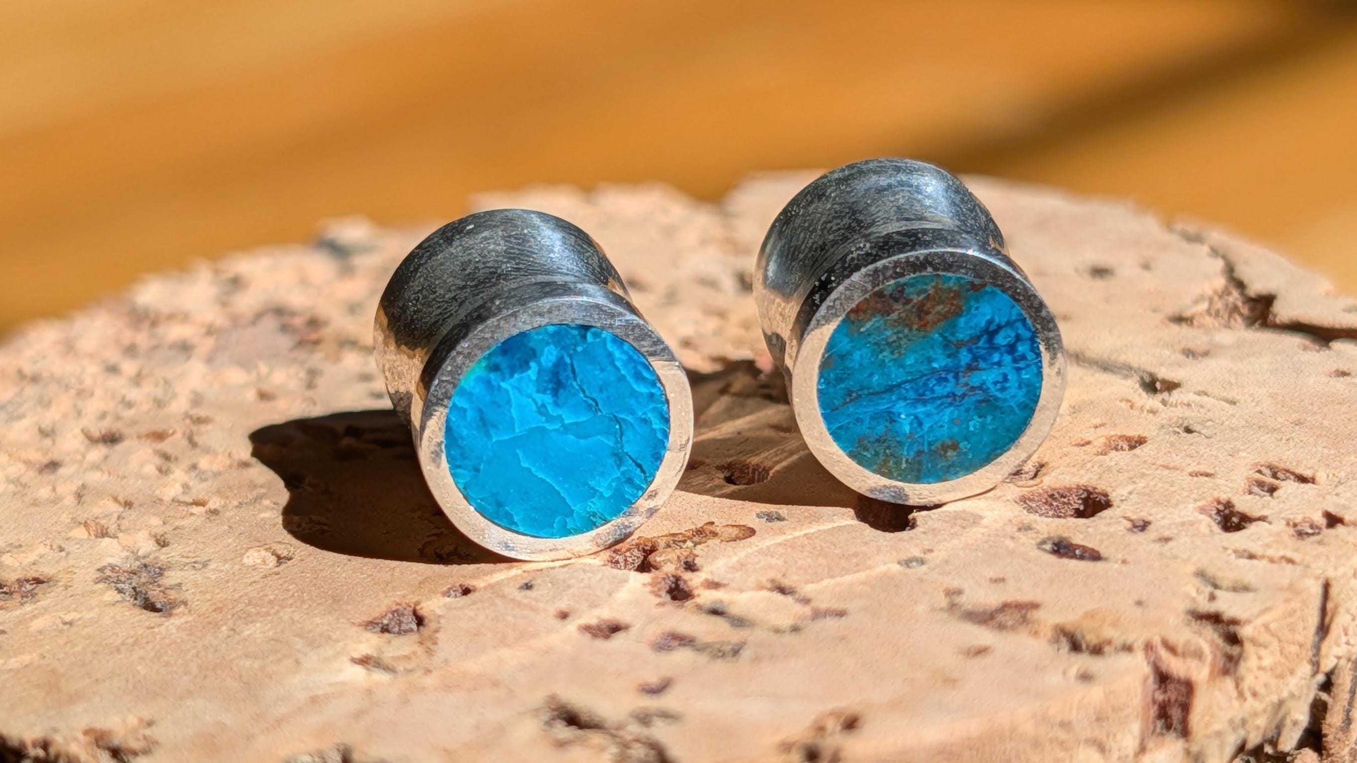 Loving this new addition to my line. The natural chrysocolla I use has beautiful range to its ocean grean and blue shades. Every pair of these gauges are unique in that way. These are gorgeous flared gauges of natural whole chrysocolla stone lined with sterling silver. The chrysocolla is flush with the silver on two of the four faces, the other side is covered with silver because of the cost of the work for the stones. Slight flare with the silver and small groove in the center fit to the gauge size.