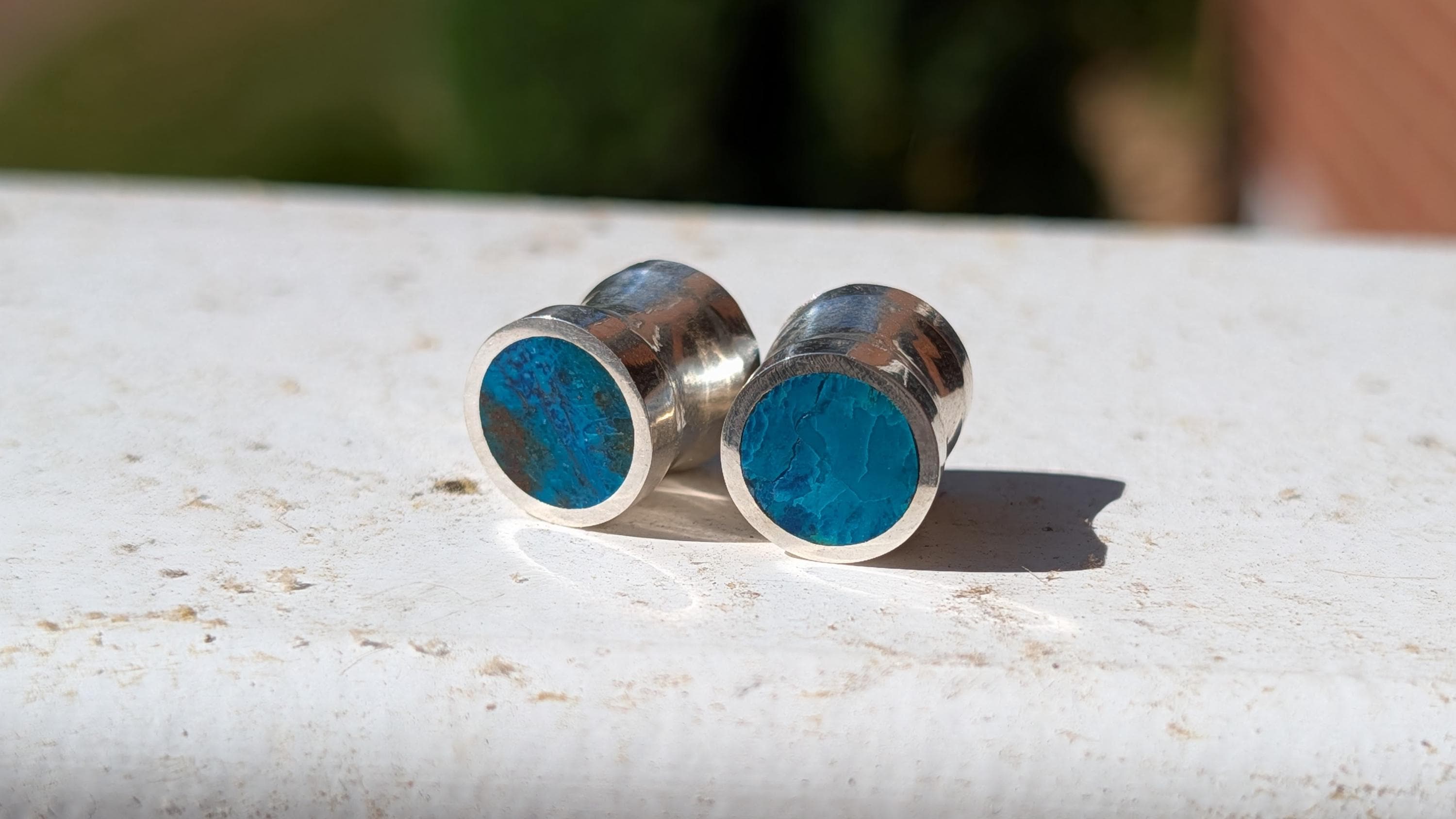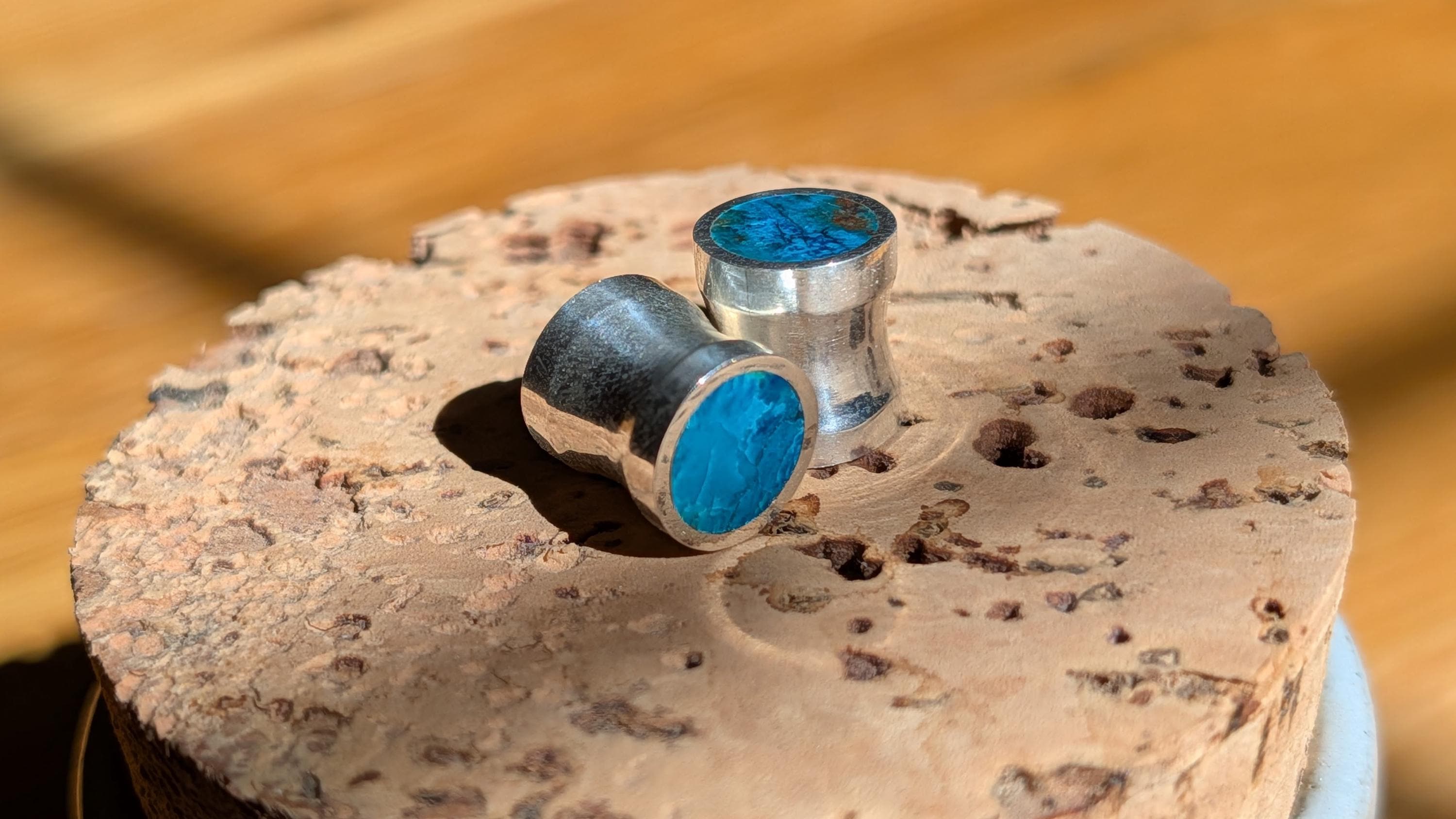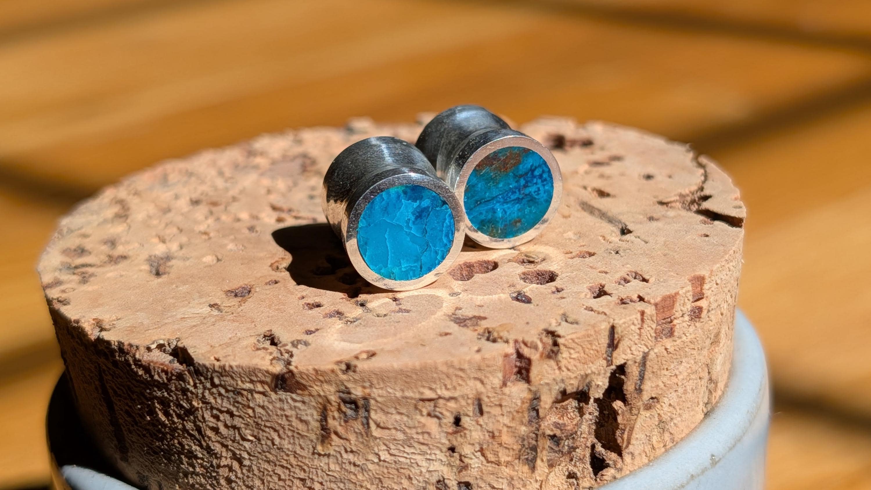 Loving this new addition to my line. The natural chrysocolla I use has beautiful range to its ocean grean and blue shades. Every pair of these gauges are unique in that way. These are gorgeous flared gauges of natural whole chrysocolla stone lined with sterling silver. The chrysocolla is flush with the silver on two of the four faces, the other side is covered with silver because of the cost of the work for the stones. Slight flare with the silver and small groove in the center fit to the gauge size.