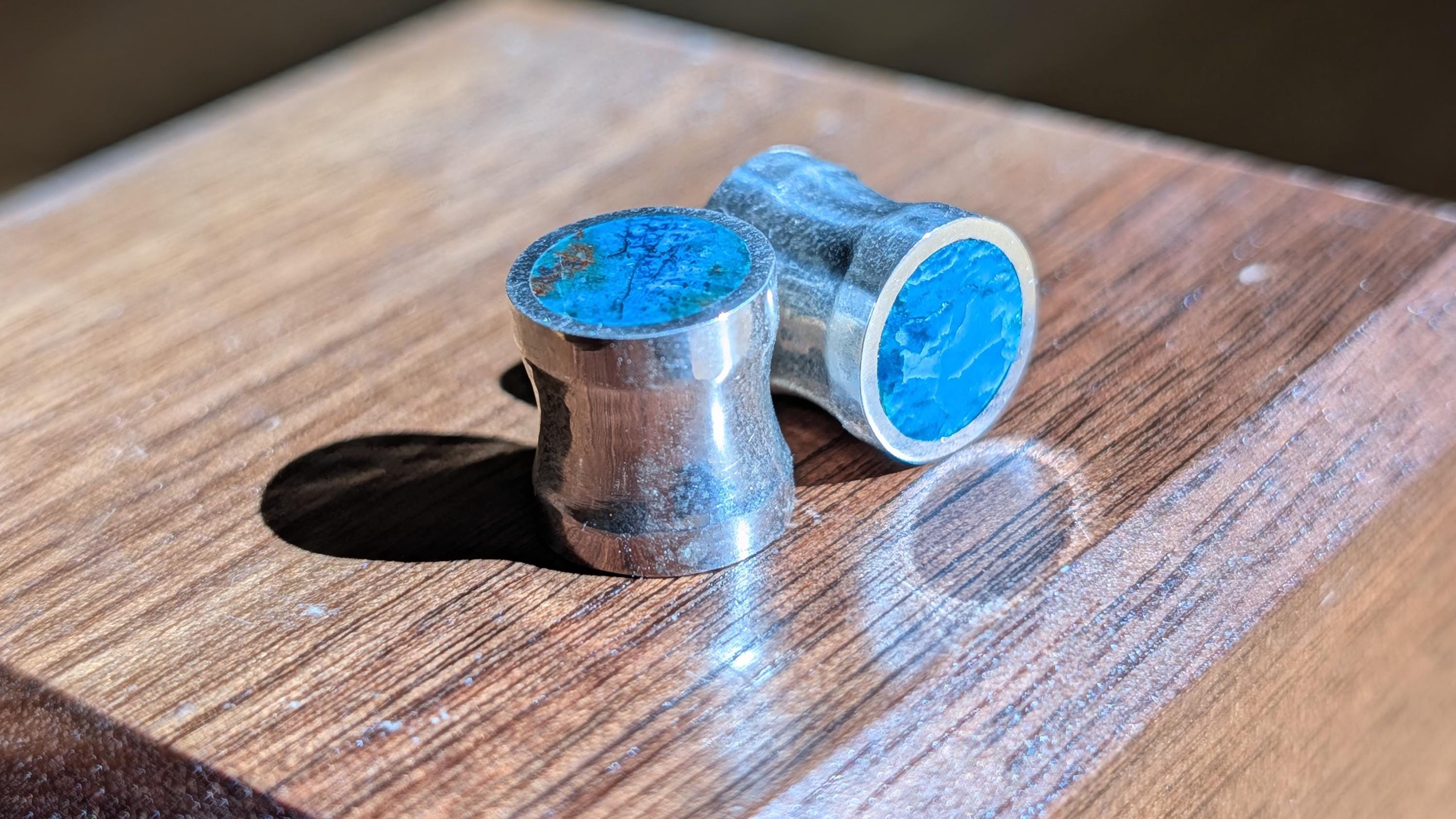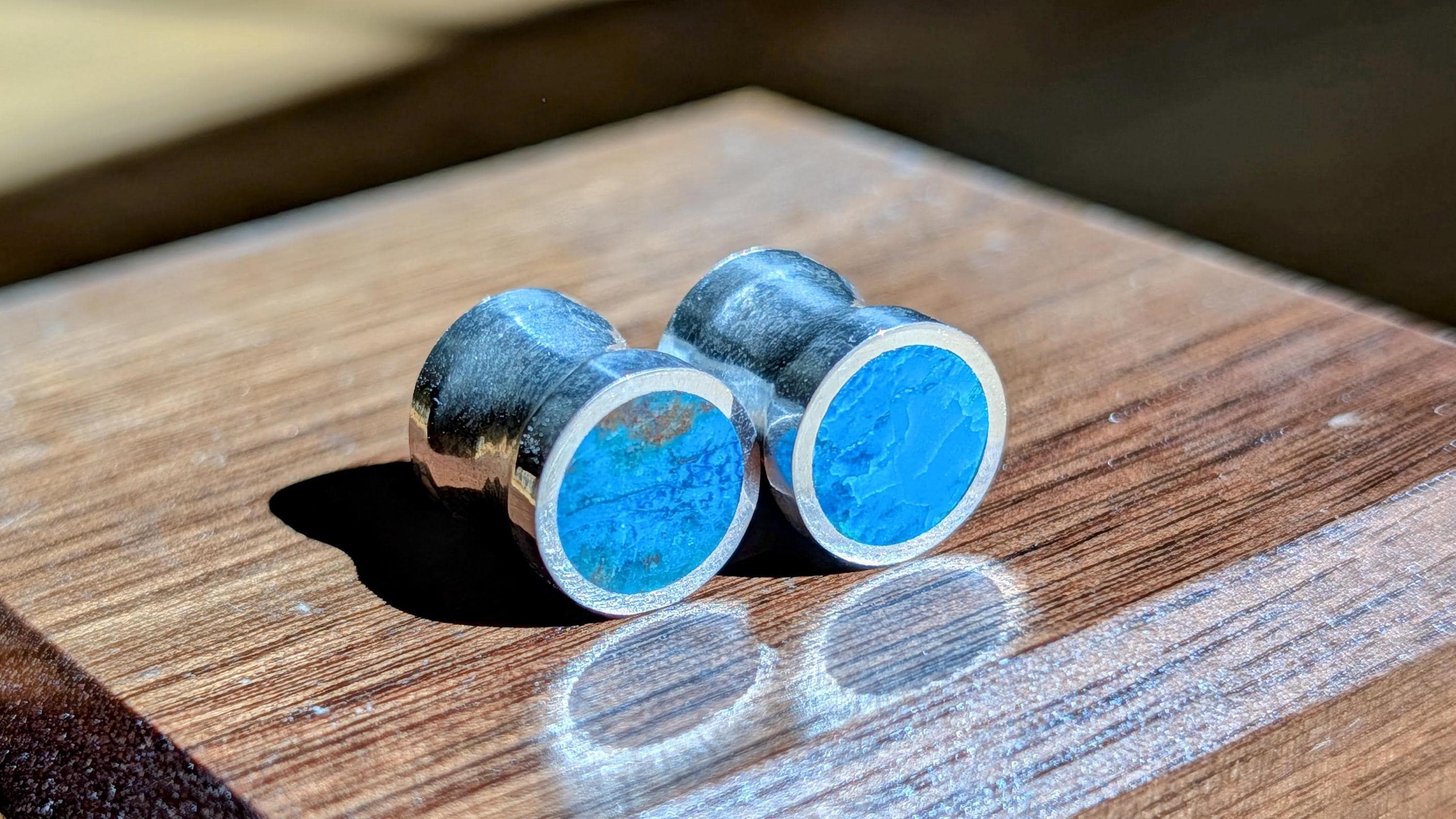 Check these gauges out if you're a fan of deep greens and blues. They contrast so well with silver or gold plating. They are always unique and beautiful and work with anything.