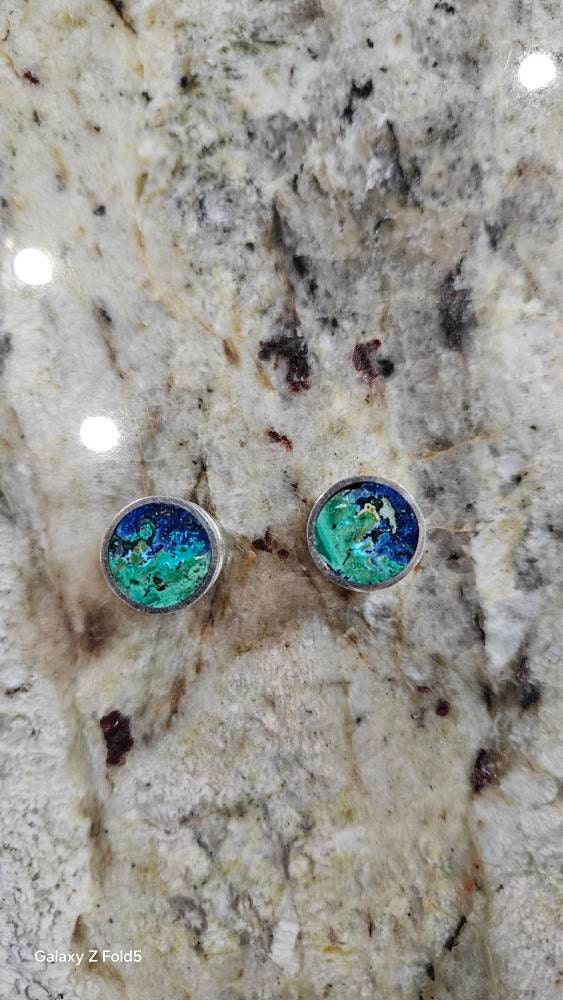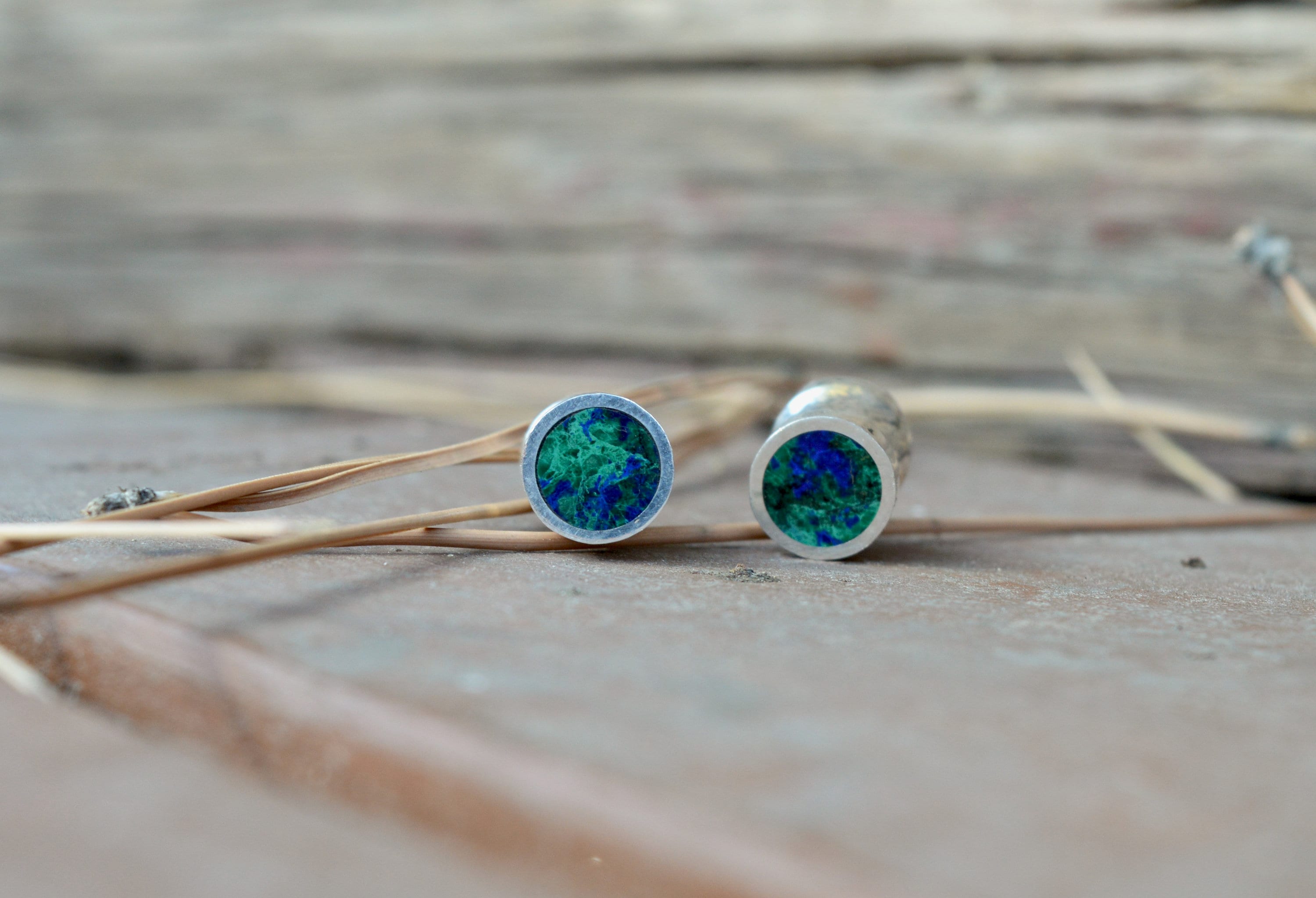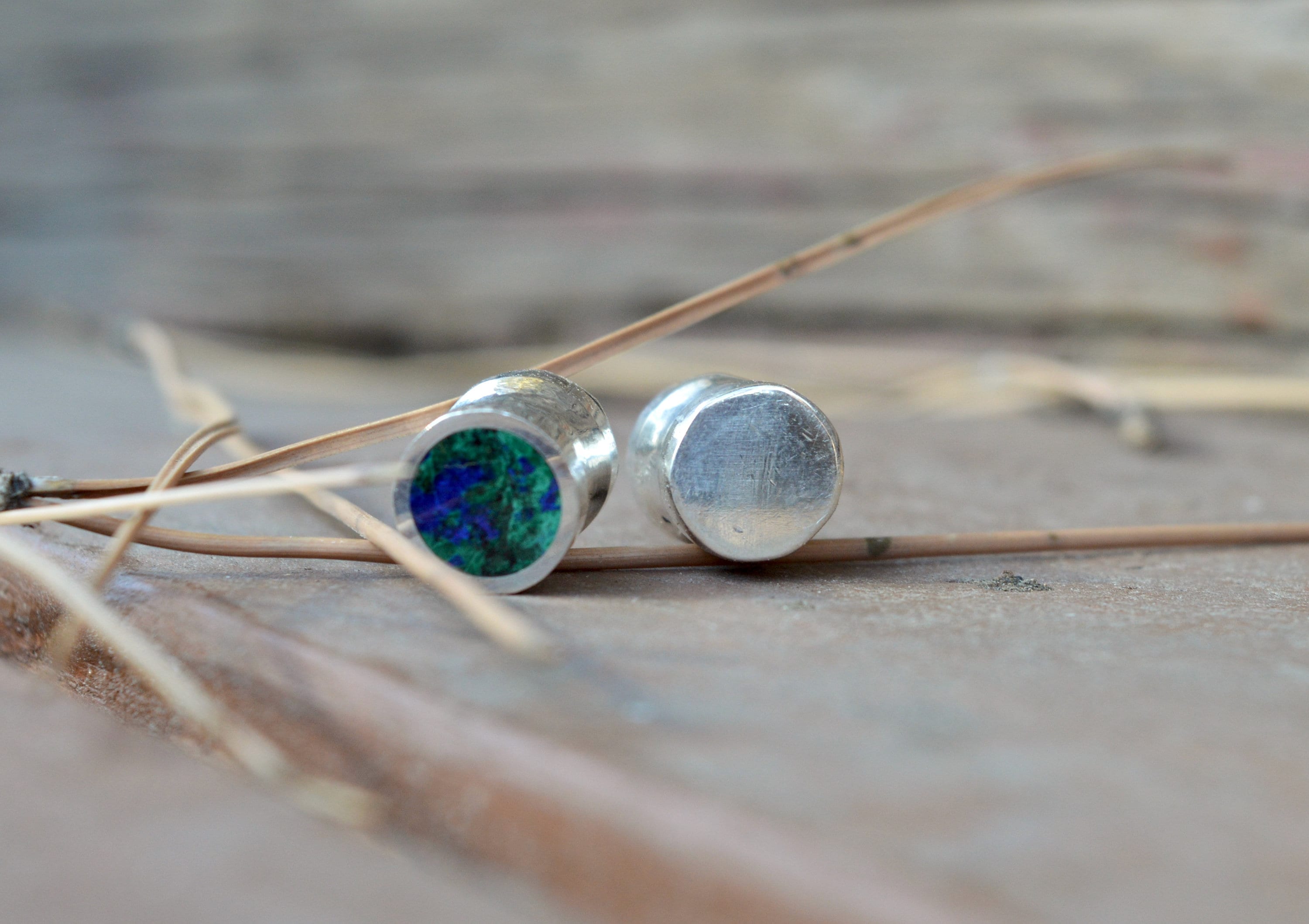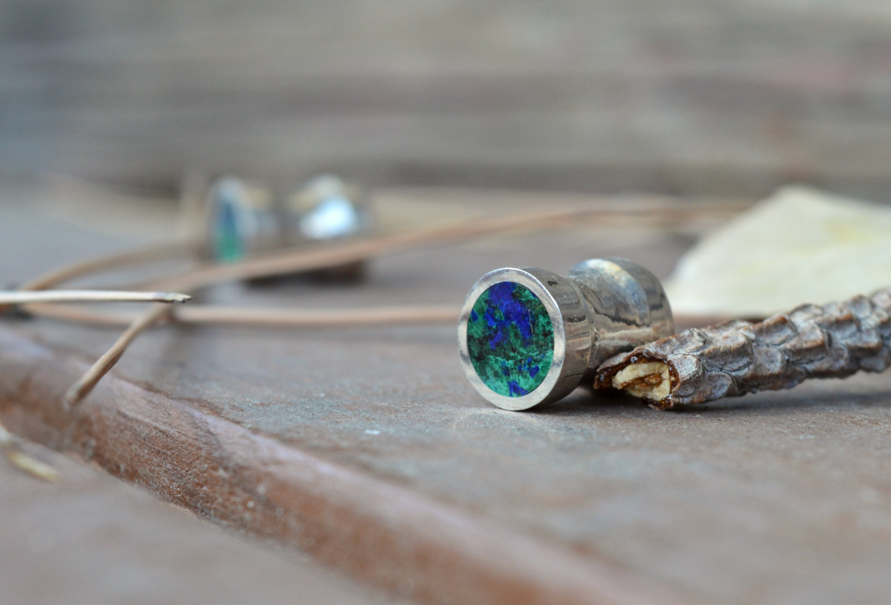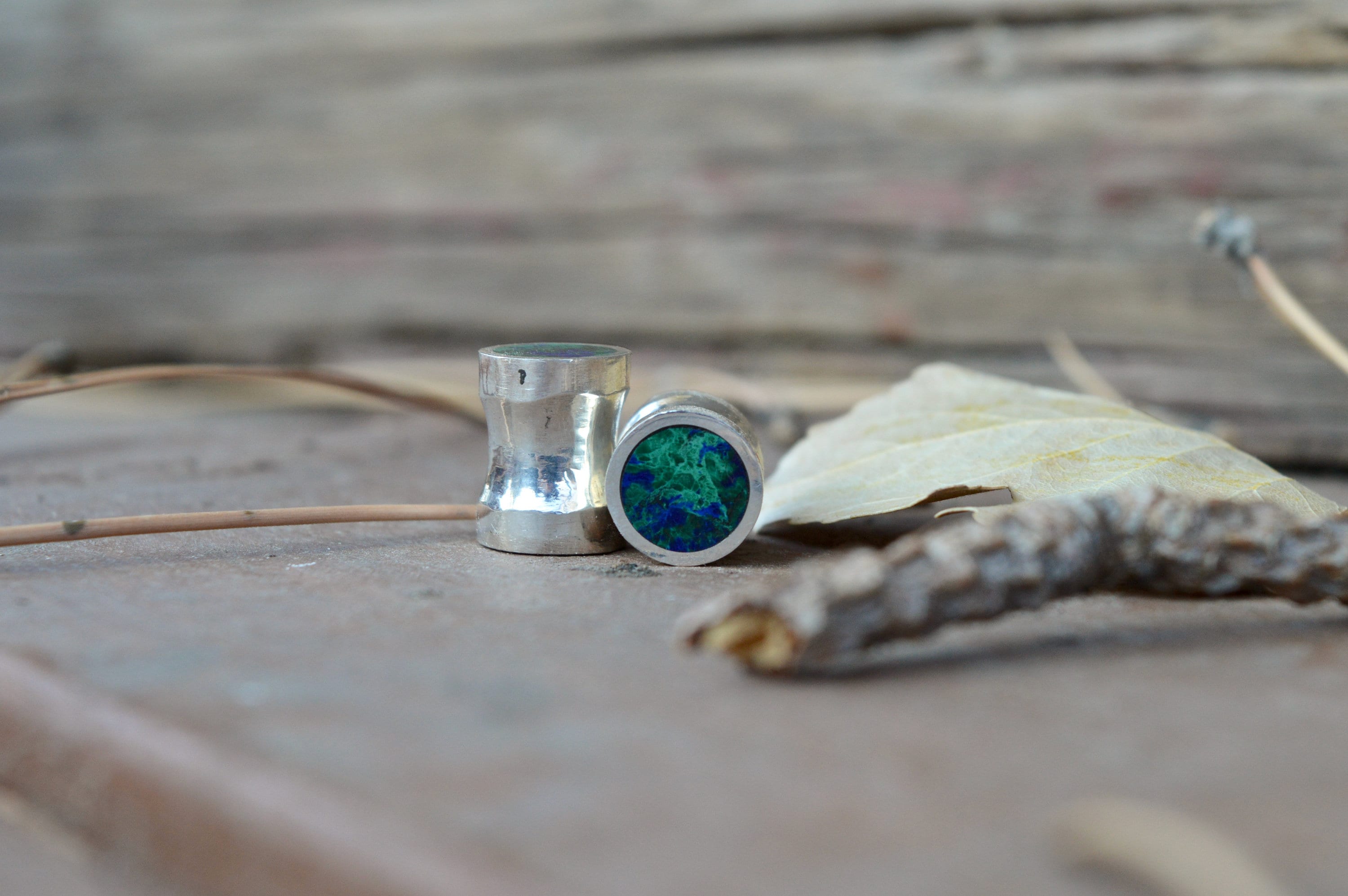 I had a customer reach out to me about making her Azurite Malachite plugs to match her beautiful ring. I am so glad I did. Just look at the gorgeous color of the blues and greens. Natural Azurite Malachite is so cool in how it shows multiple shades of green and blue in just one stone. Beautiful flared gauges of Azurite Malachite lined with sterling silver. The Azurite Malachite is flush with the silver on one face of each plug. As shown in the pictures, the other side is silver. Slight flare with the silver and small groove in the center fit to the gauge size.